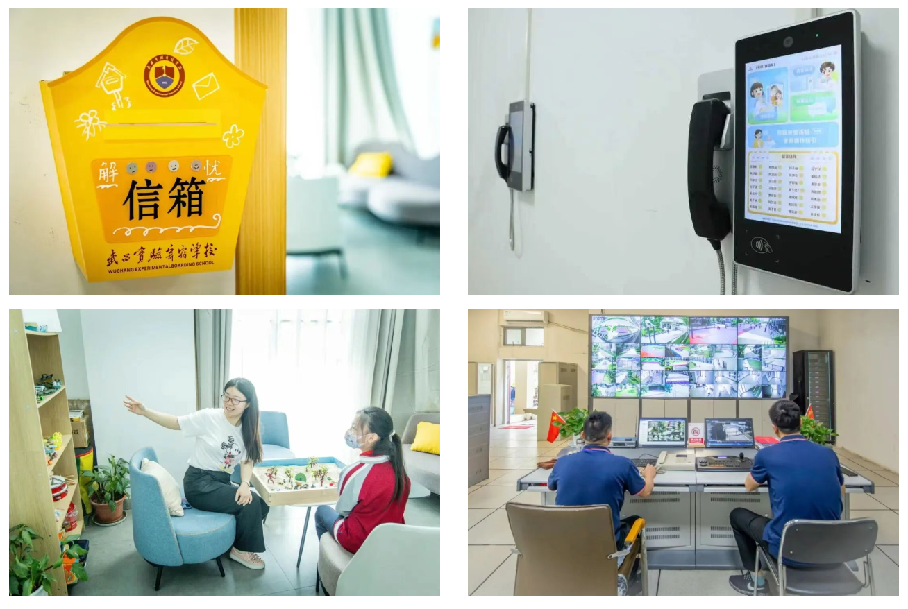 學校實行全寄宿封閉式管理,嚴禁學生攜帶任何電子設備進校園,宿舍樓有公共電話和可視頻電話機。