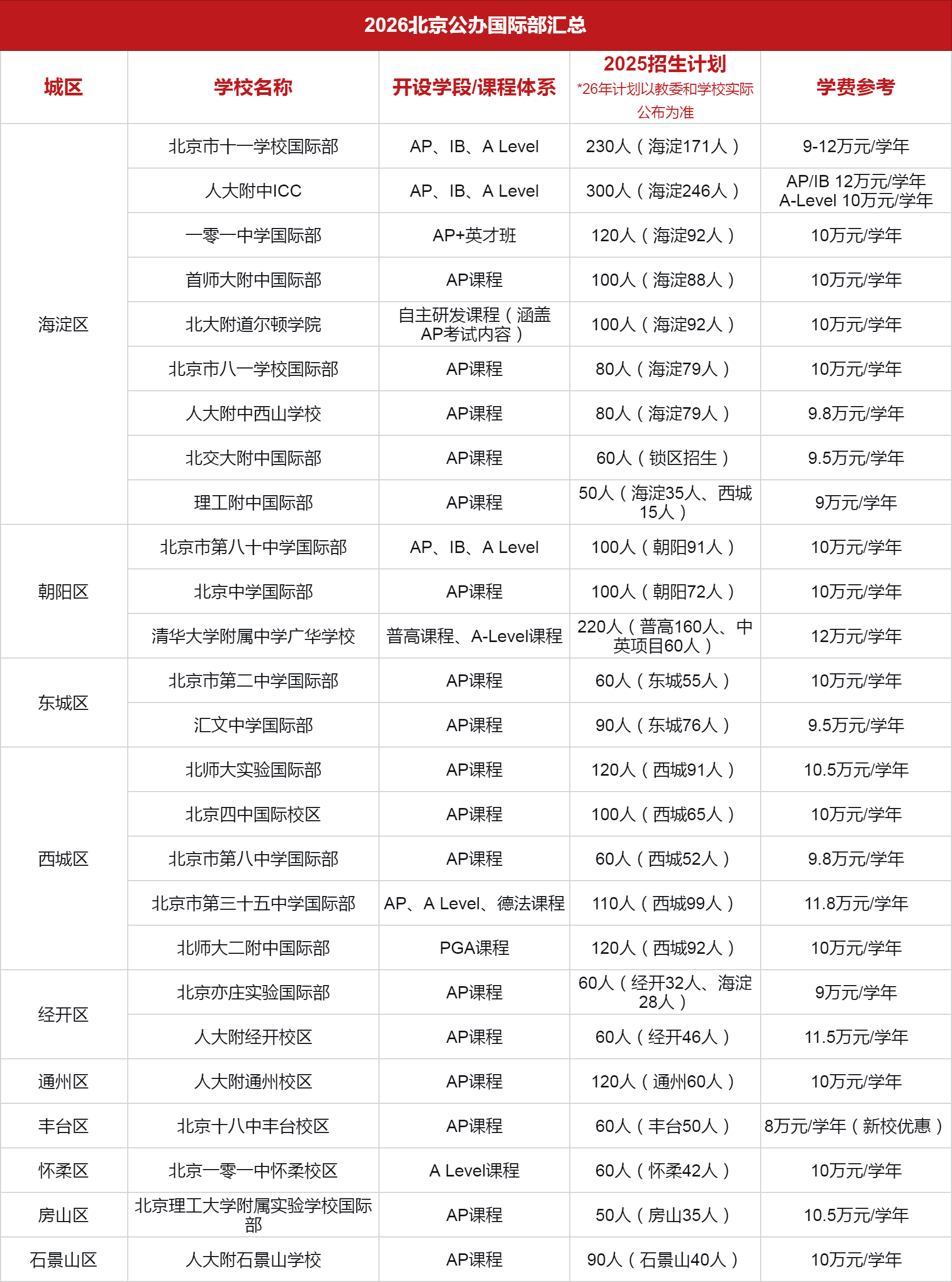 據不完全統計,目前北京約有26所公立國際部,這些學校分布在西城、海淀、朝陽等10個城區。